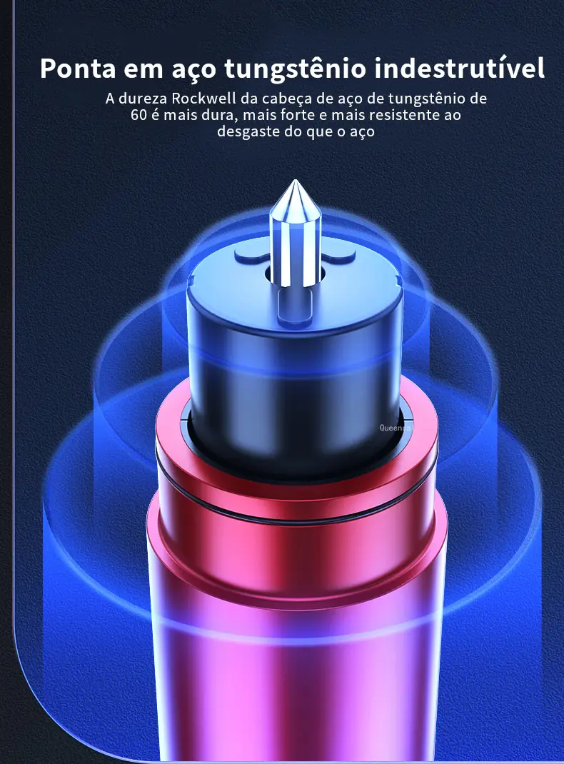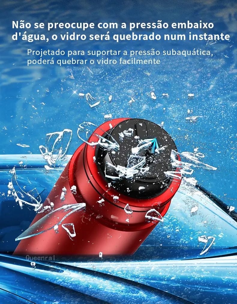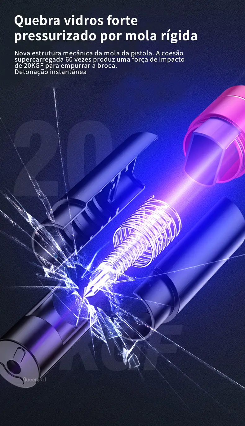 A ponta de quebra janelas é feita de aço de tungstênio de alta resistência e dureza Rockwell 55. Com um simples clique, você pode quebrar a janela do carro e com a força de impacto instantânea equivalente ao impacto de um peso de 20kg(KGF). E mesmo debaixo d’água, a janela pode também ser quebrada.