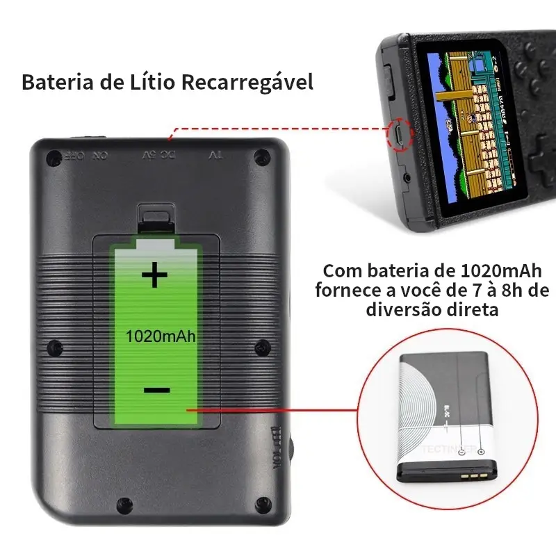 Com sua bateria recarregável de lítio de 1020mah, você pode jogar por até 8 horas sem interrupção. Escolha entre sete opções de cores – amarelo, vermelho, preto, azul, verde, rosa e branco – para personalizar seu dispositivo. E para uma experiência de jogo ainda melhor, conecte-o à TV usando o cabo AV incluso.